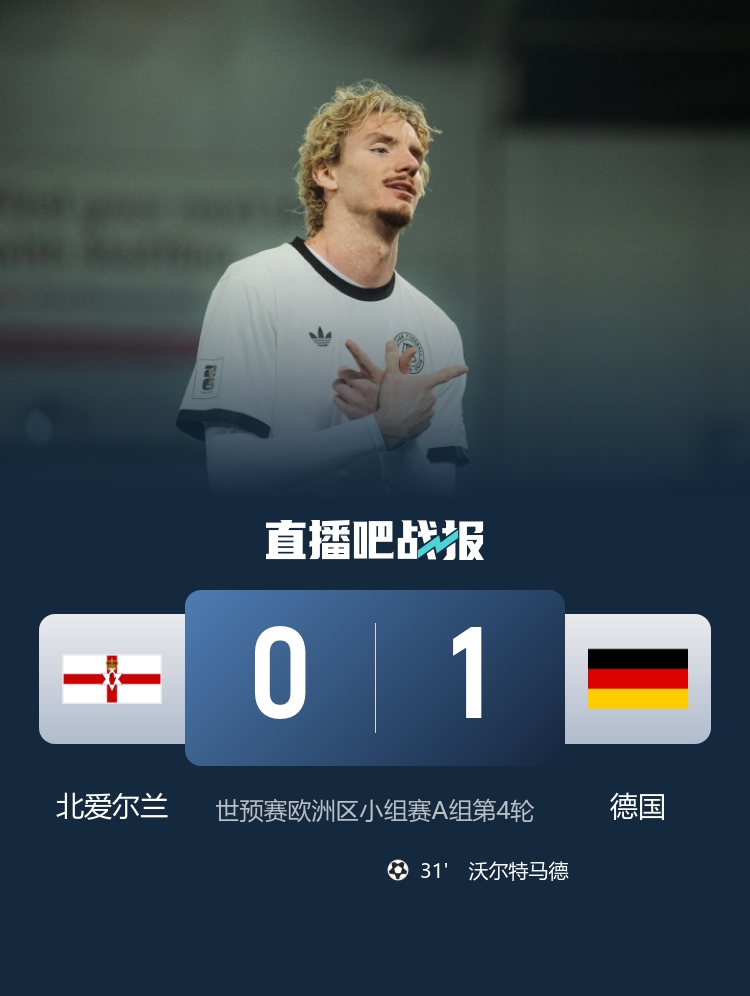 世預賽中德國隊以1比0戰勝北愛爾蘭取得三連勝 沃爾特馬德打入制勝球 阿德耶米錯失單刀機會