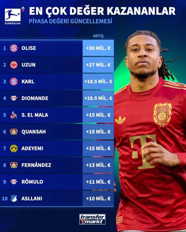 德甲的其他球員也紛紛上榜,拜仁的卡爾與萊比錫的迪奧曼德同樣令球迷欣喜,二人的身價均增加了1850萬歐元,展現了這兩支球隊對年輕球員培養的深厚功底。此外,科隆的賽義德-艾爾-馬拉、勒沃庫森的寬薩、以及多特蒙德的阿德耶米等球員,都各自迎來了1500萬歐元的身價增長,顯示出德甲聯賽不斷湧現的新生力量。